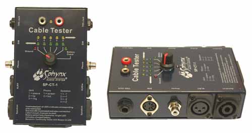 Testeur de câble audio - SP-CT-1-U Testeur de câble - XLR 3 br, Jack 6,35mm, RCA/Cinch, DIN 5br, Speakon : contrôle par LED - banane : contrôle visuel et sonore. Sert dans ce cas de fi gure de testeur de continuité - alimentation par pile 9V non fournie - boitier métal |